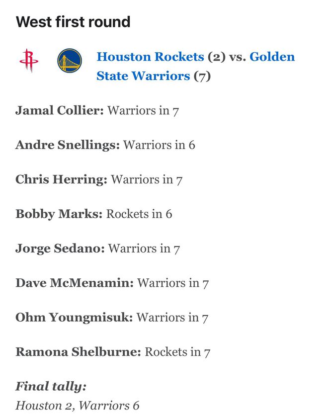 ESPN专家组预测了这轮系列赛,其中6位专家看好勇士,仅2人看好火箭;