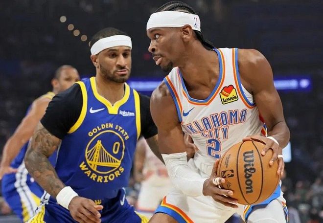 比赛上来,雷霆队借主场之势火力全开占据着场上的主动权,勇士队靠着滚烫的三分手感苦苦追分,雷霆队一度取得14分的巨大领先优势,勇士队在半场结束时落后13分。易边再战,雷霆队进攻断电,勇士队抓住机会多点开花一举追上比分。随后,两队陷入拉锯战,比分咬得很紧,比赛悬念一直拖到最后,SGA迎着追梦格林命中大心脏三分球杀死比赛。最终,勇士队以97-104不敌雷霆队。
