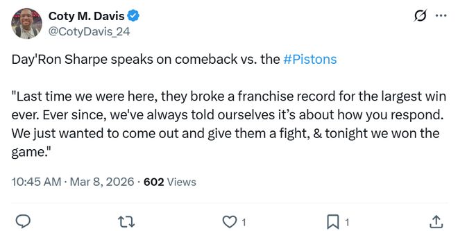 赛后篮网内线夏普就表示:“上次我们来到这里时,活塞赢了53分创造队史最大分差,从那时起我们就一直告诉自己,关键不是输多少分,而是看你如何回应,我们就是想从跌倒的地方爬起来和他们拼一场。”