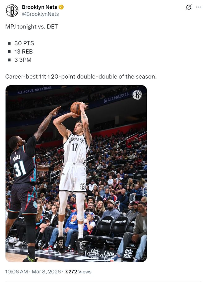 这场比赛小迈克尔-波特39分钟,25中10,三分12中3,罚球7中7,拿到30分13篮板1助攻2抢断1盖帽,他已经第11场比赛完成20+10的数据。
